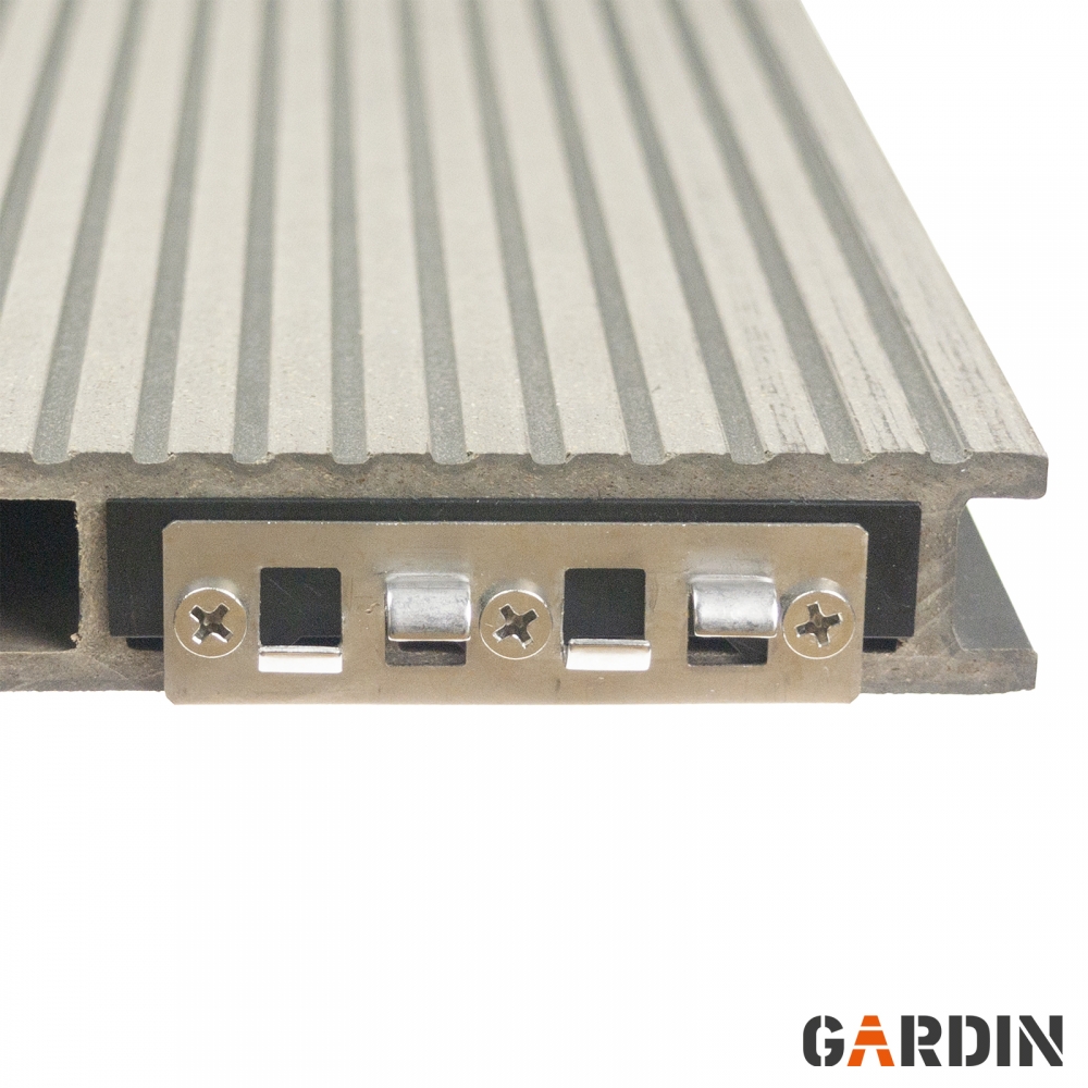 Кліпса виготовлена із нержавіючої сталі кріпиться за допомогою з’єднувача до переднього чи бічного краю дошки чи лаги. Дозволяє непомітне встановлення фінішної планки. Це забезпечує "вільний" монтаж фінішної планки.