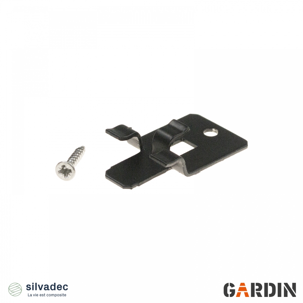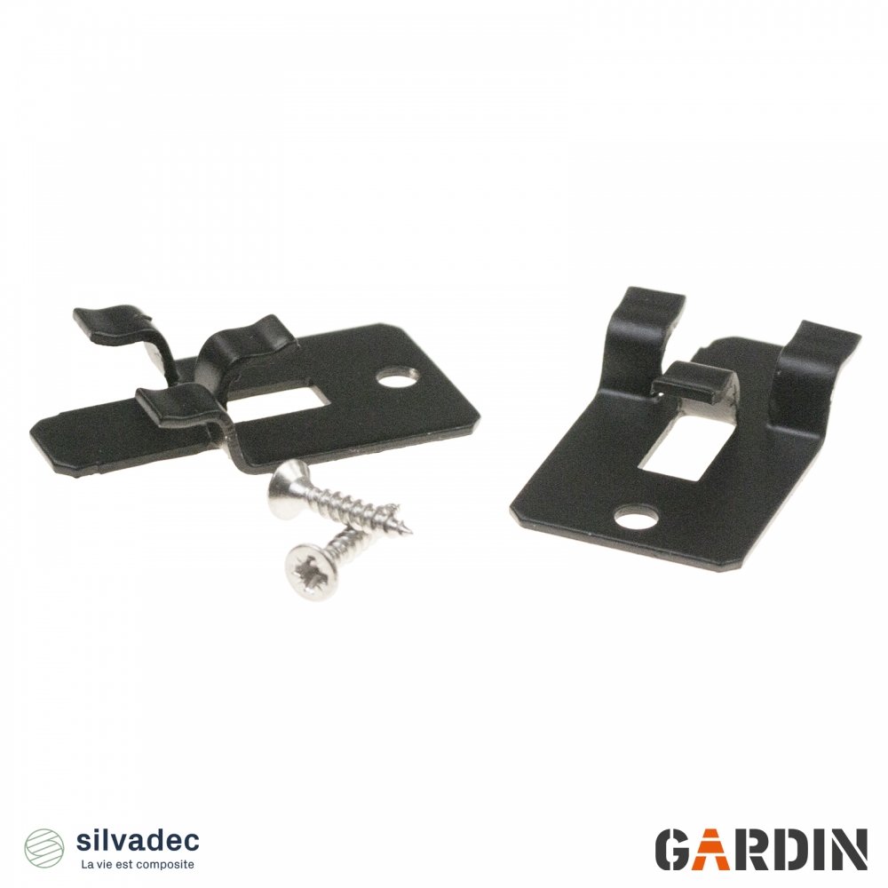 Монтажна кліпса для терасної дошки Silvadec. Виготовлена з нержавіючої сталі, пофарбована порошковою фарбою чорного кольору. Товста та міцна структура та глибока фаска для шурупів дозволяють їй дуже добре прилягати до дошки, що полегшує та прискорює монтаж.