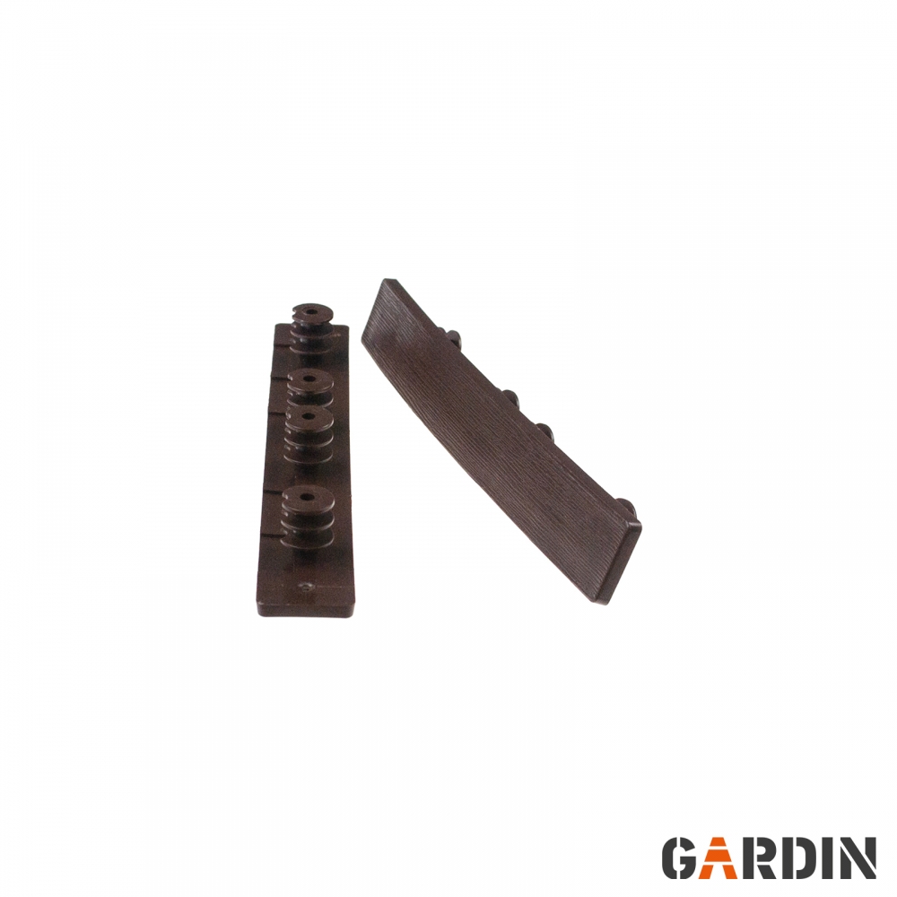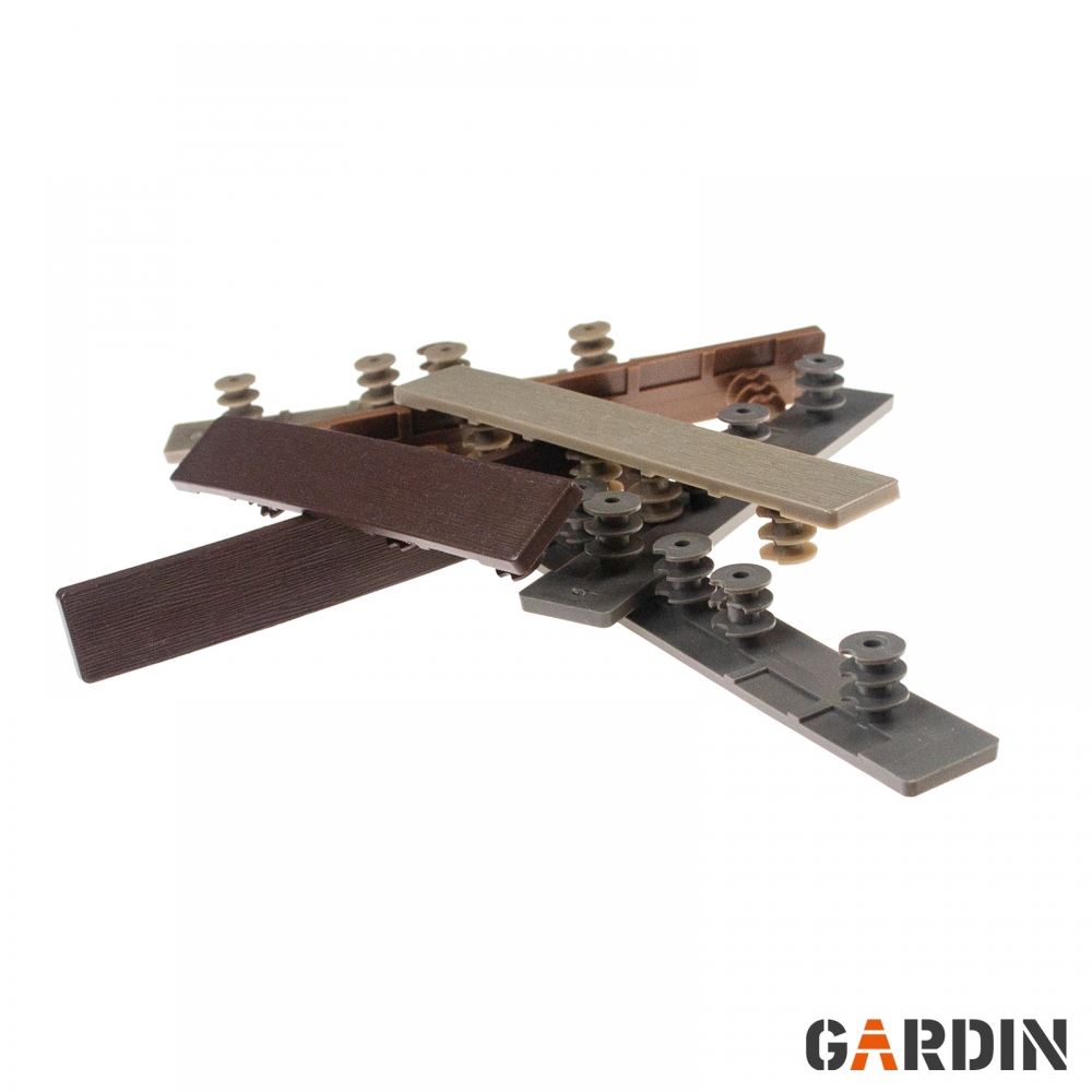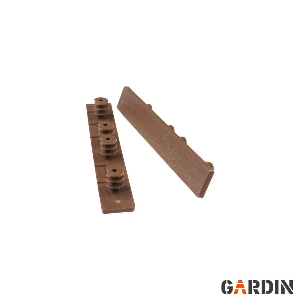 Спеціальні торцеві заглушки для терасної дошки Gardin Deco. Виготовлений із суміші полімерів високої щільності та деревних волокон. Вони товсті, міцні та довговічні. Вони містять УФ-фільтри та стійкі до руйнування. Доступні кольори, що відповідають кольорам дощок.