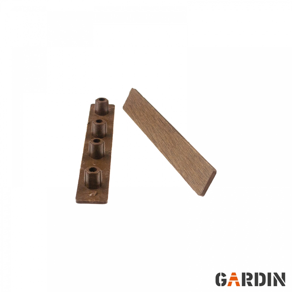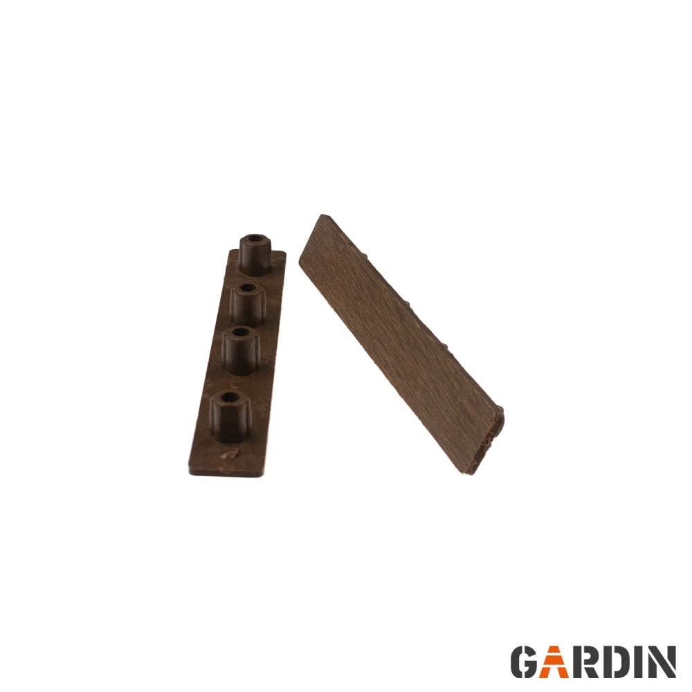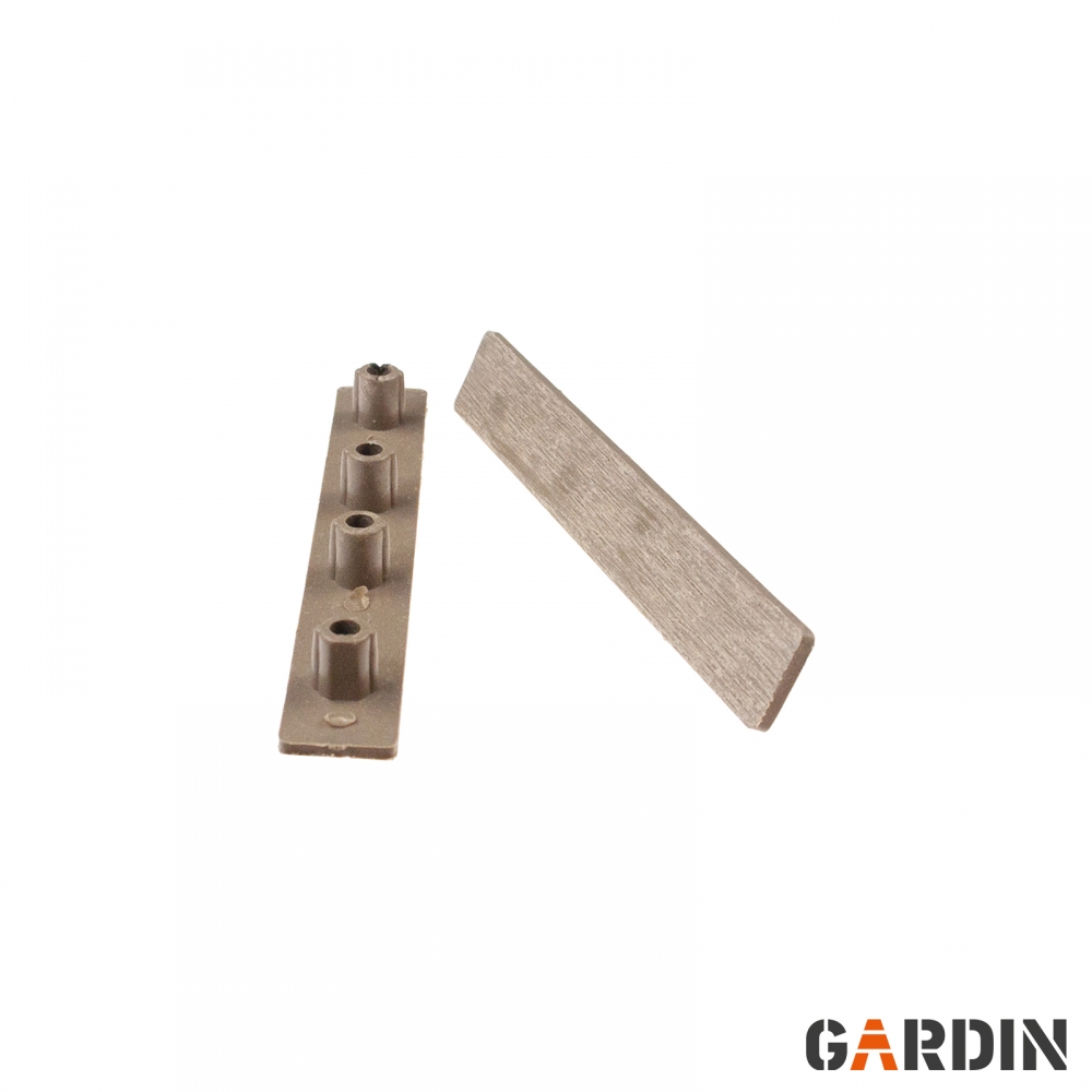 Торцеві заглушки для терасної дошки Gardin Natur. Виготовлений із суміші полімерів високої щільності та деревних волокон. Вони товсті, міцні та довговічні. Вони містять УФ-фільтри та стійкі до біологічного руйнування. Доступні кольори, що відповідають кольорам дощок.